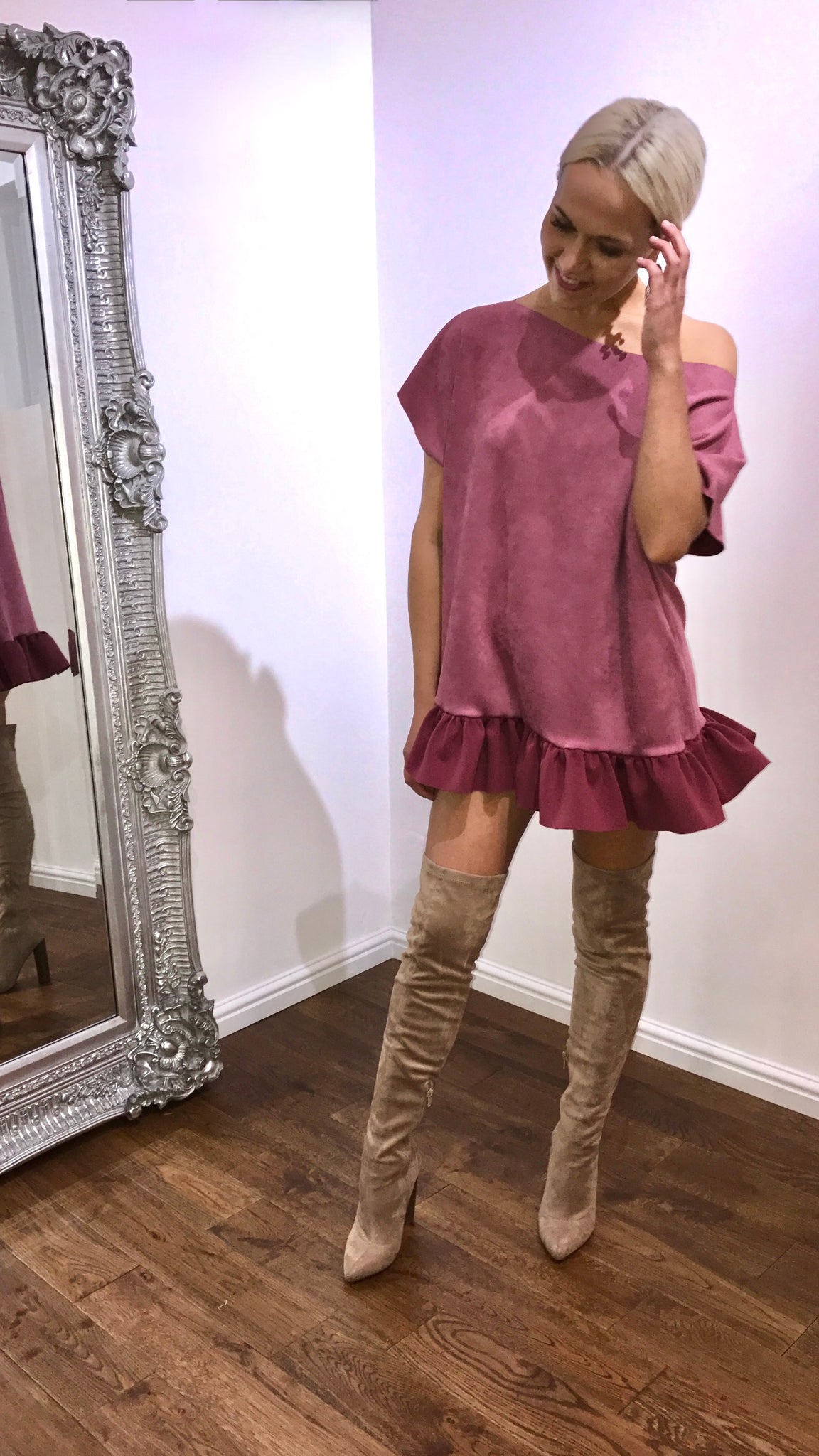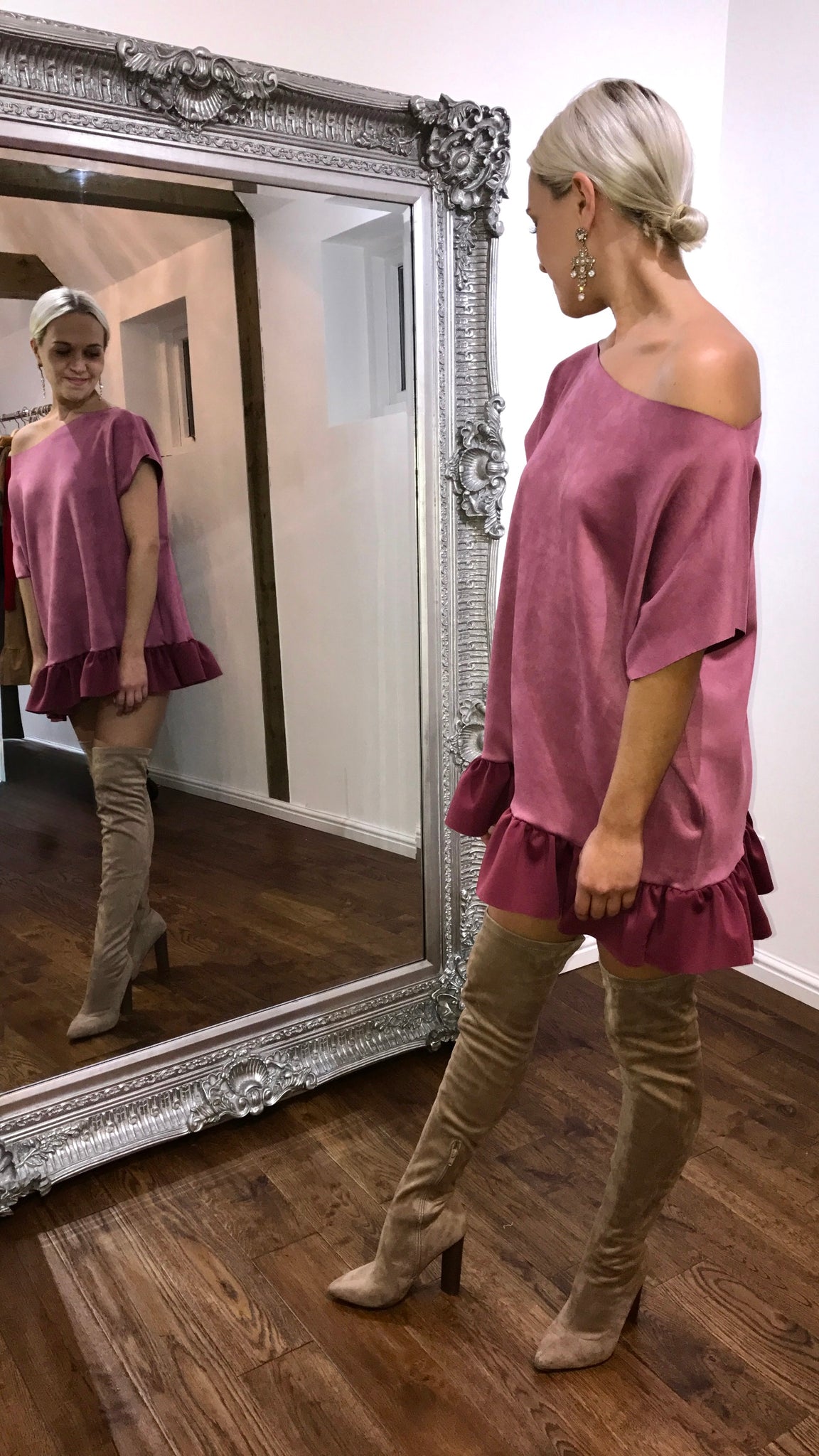 The Chloe dress is made from a luxuorious suede/scuba mix fabric that creates a very oversized look. If you are over 5,3 please put in notes your height so i can alter length.